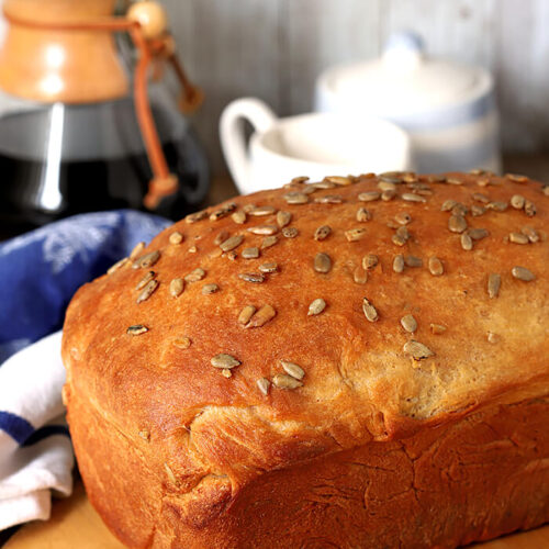 Growing up, bread was Wonder or a loaf of French bread served with spaghetti and all of it was purchased from the grocery store. I didn’t make my own bread until I was an adult and it all started with this recipe for Billowy Off-White Bread with Honey and Sunflower Seeds; an enriched bread with eggs, milk, butter and honey. It is truly OMG good!