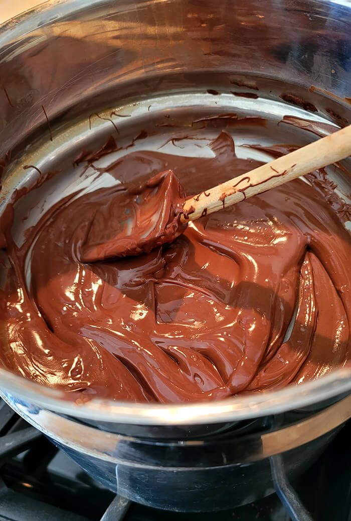 - Melt your chocolate in a double boiler or a gerry-rigged version with a saucepan and a heatproof bowl on top. Chocolate that gets too hot seizes and is ruined…trying to keep on top of it’s temp when microwaving it is simply not worth it. Trust me. The best way to temper your chocolate is to use a thermometer and make sure it does not get above 90 degrees Fahrenheit.