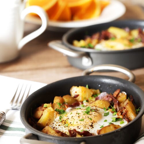 Corned Beef Hash with Bacon is an easy and delicious dish using leftovers, including corned beef and potatoes, that are seasoned and warmed and topped with a fried egg.