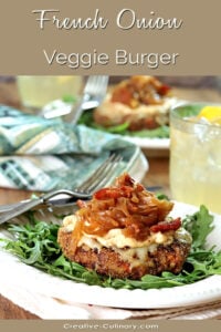 This French Onion Veggie Burger is a veggie version of the delicious Avalon Burger from Ted’s Montana Grill. It’s all about the condiments!