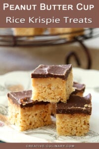 Take your treats to another level…try these Peanut Butter Cup Rice Krispie Treats. Rice Krispie Treats are layered with a peanut butter layer and topped with chocolate ganache.