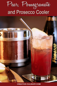 A nice transitional beverage when summer is waning but we still have beautiful Fall ldays. This Pear and Pomegranate Cooler with Prosecco is perfect when pears are at their peak.